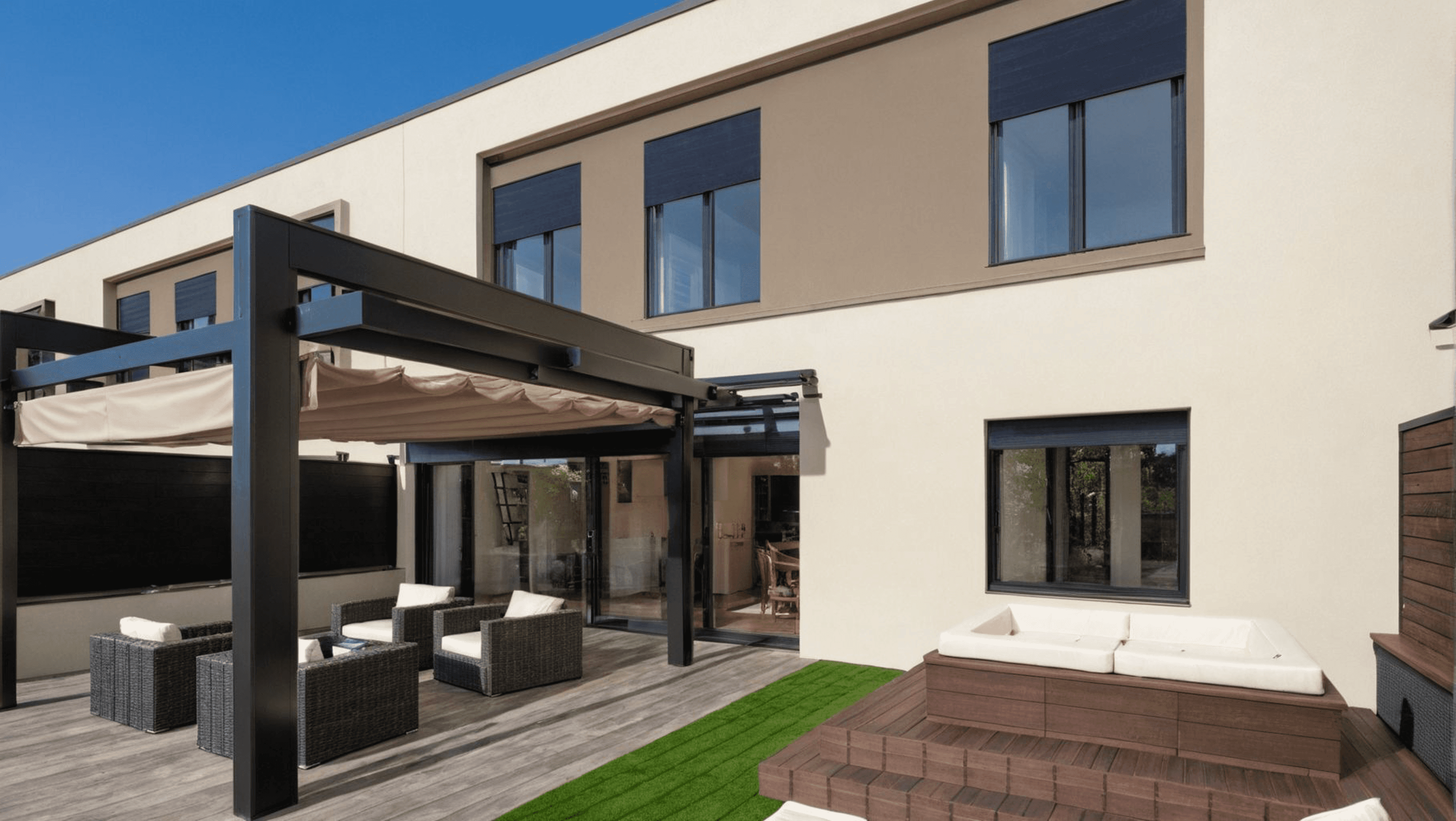 Arhitektura temelji na čistih linijah, ravnih strehah in minimalističnem videzu, ki ustvarjajo elegantno in harmonično celoto. Vsaka enota ima svoj prostoren zasebni atrij, ki je smiselno povezan z zeleno okolico in tako ponuja prijetno zasebnost ter stik z naravo.